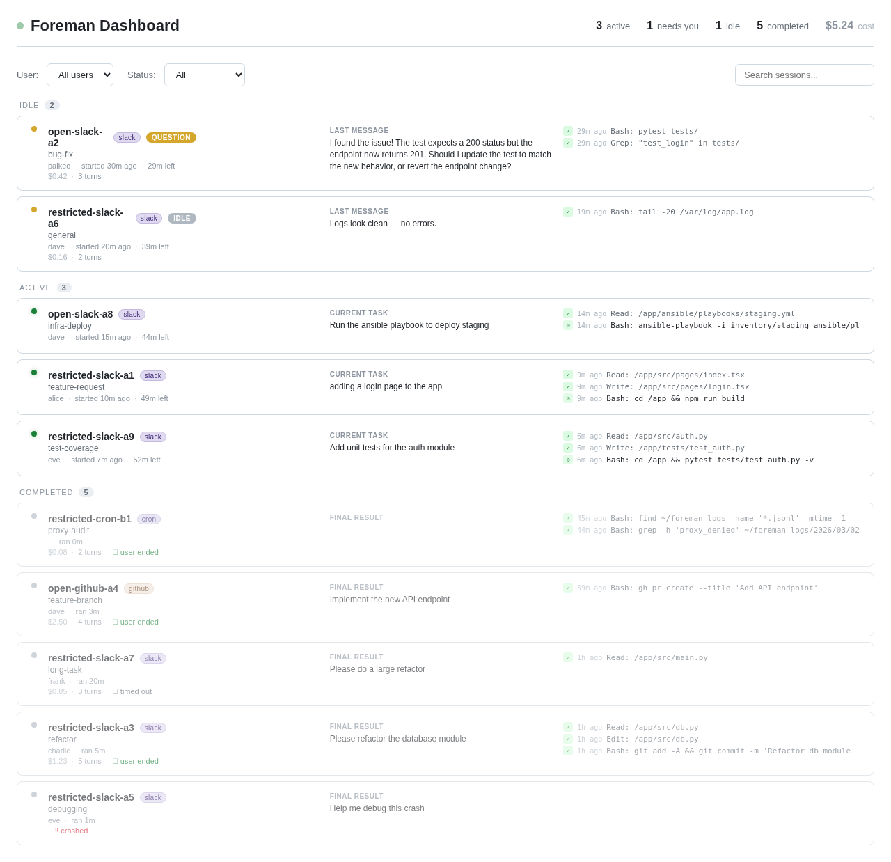 Well, Foreman ships with a web dashboard: it’s an optional independent service that reads session logs and renders active & past sessions so you can see what the agents are doing, in real-time.