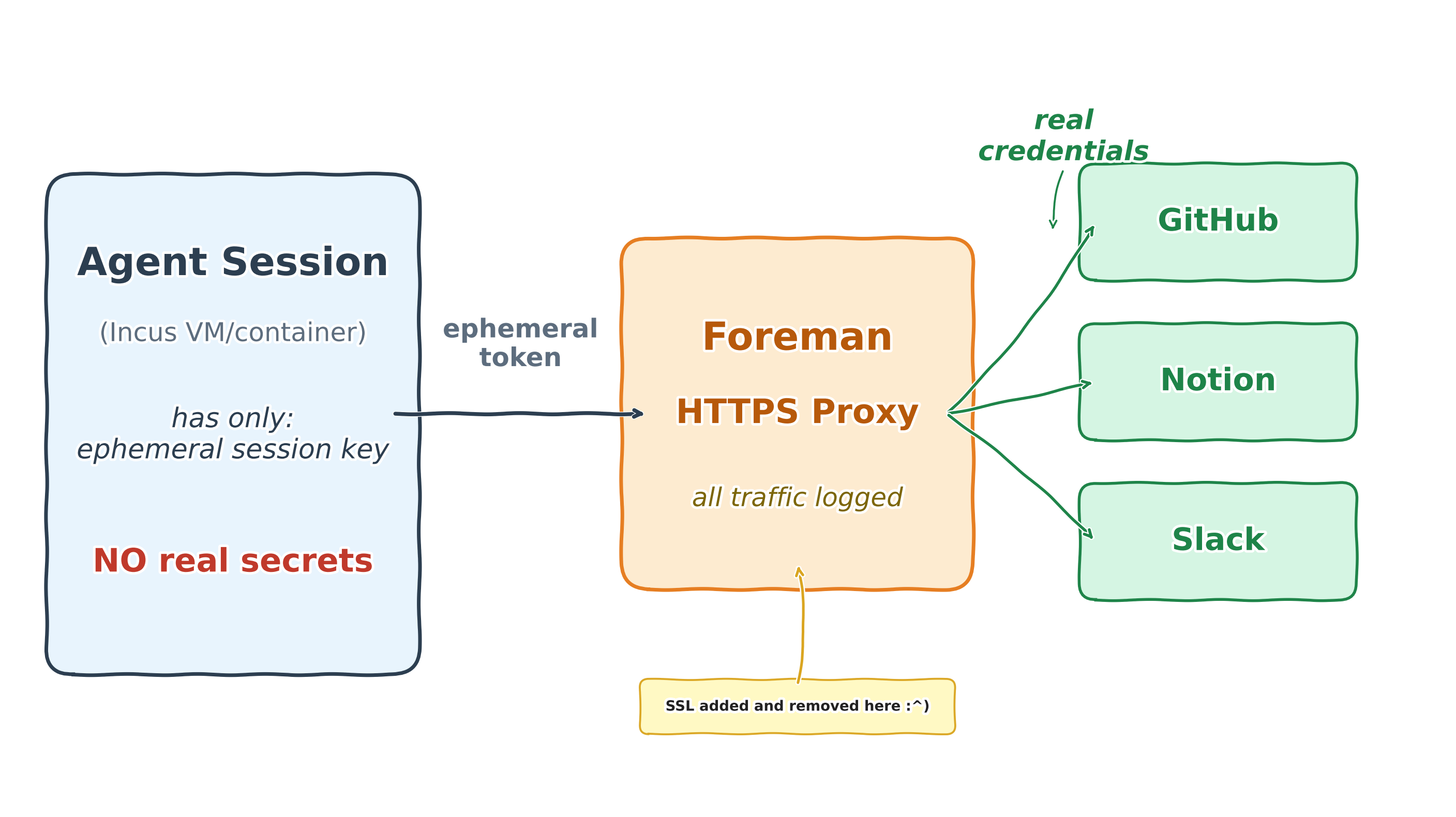 The proxy intercepts all traffic, and lets capabilities hook into it. This way they can inject the real authentication headers, but also log details about every request. That means agents don’t have access to any secret (other than an ephemeral session key), and all activity gets logged.